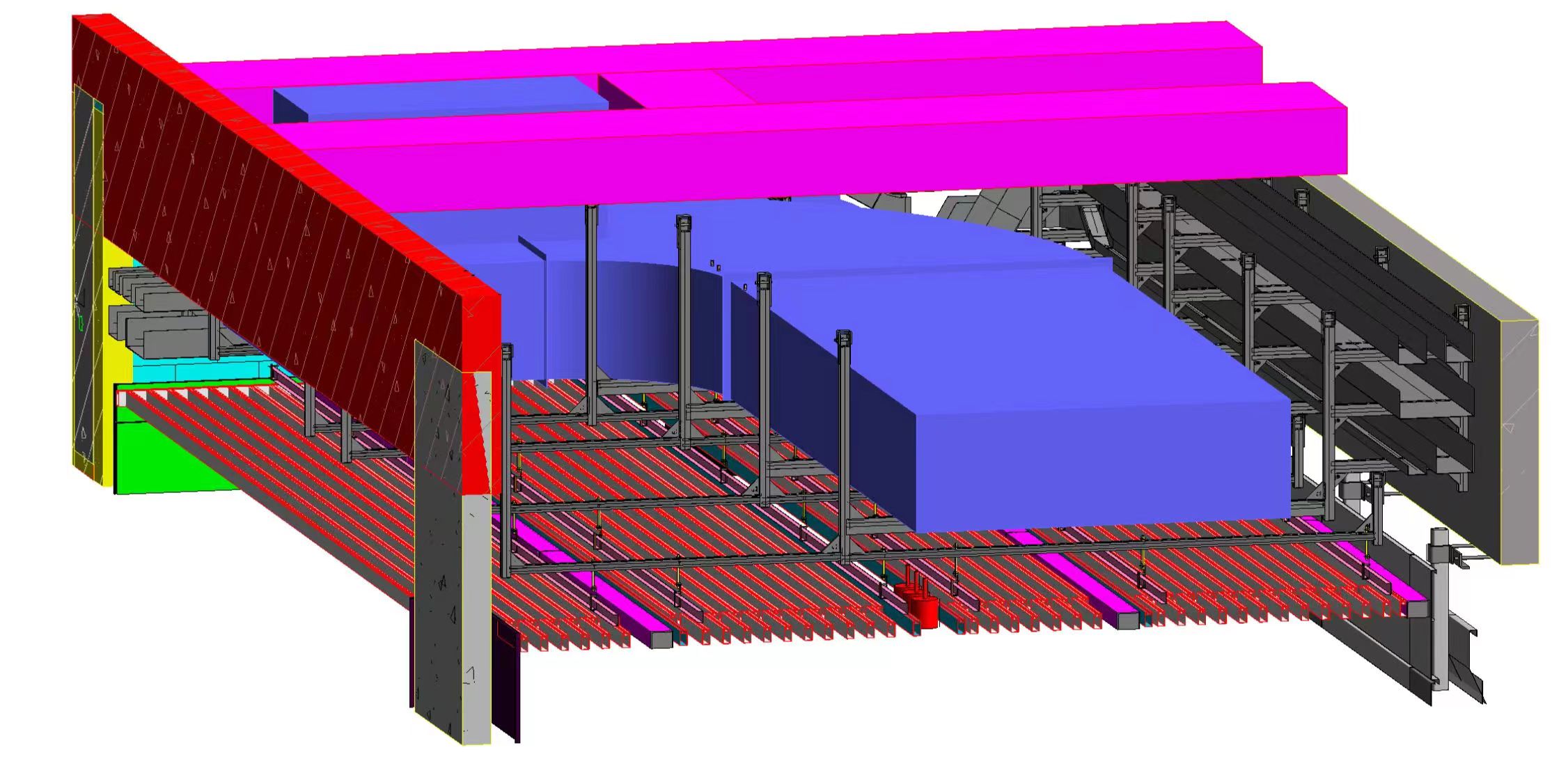 本工程分三個標(biāo)段,合計總建筑面積為56.1萬㎡,建筑最高高度34.8m,其中一、三標(biāo)段為多層大跨度鋼結(jié)構(gòu)廠房。眾所周知,對于鋼結(jié)構(gòu)廠房支架設(shè)計一直是行業(yè)內(nèi)的難題。華固充分利用BIM技術(shù),自主研發(fā)的成品